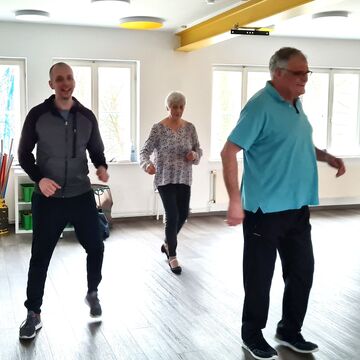 Als ich neulich den Befund eines Patienten von der Bundeswehr aufnahm, fing dieser plötzlich an, auf seinem Stuhl zu wippen. Erstaunt schaute ich ihn an. Da antwortete er, „ich wusste gar nicht, dass ihr hier auch Square Dance anbietet. Jetzt hörte ich auch die Musik aus dem Saal Malente durch die Wand dringen. Er hatte während seiner Ausbildung in den USA tanzen gelernt und war voll begeistert. So kam es, dass die gesamte Belegschaft von Mensch in Bewegung, die sich alle 3 Monate zu einer internen Fortbildungsveranstaltung trifft, mehr von dem erfahren wollte, der jeden Mittwoch Nachmittag die Mitglieder mit seiner Kunst begeistert: Daniel Magdanz, unser Tanzlehrer. Als taktunsicherer Mensch, an dem schon manche Tanzlehrerin gescheitert ist, war ich von Anfang an angetan von seiner einfühlsamen Art, die Tänzer auch in kompliziertere Bewegungsmuster zu führen, ohne ungeduldig oder hektisch zu werden. Ich hätte nie gedacht, dass ein freies Tanzen ohne Anfassen und auf die Füße des Nachbarn zu achten, so viel Spaß macht. Ausprobieren lohnt sich Mi. 16:05 Uhr.