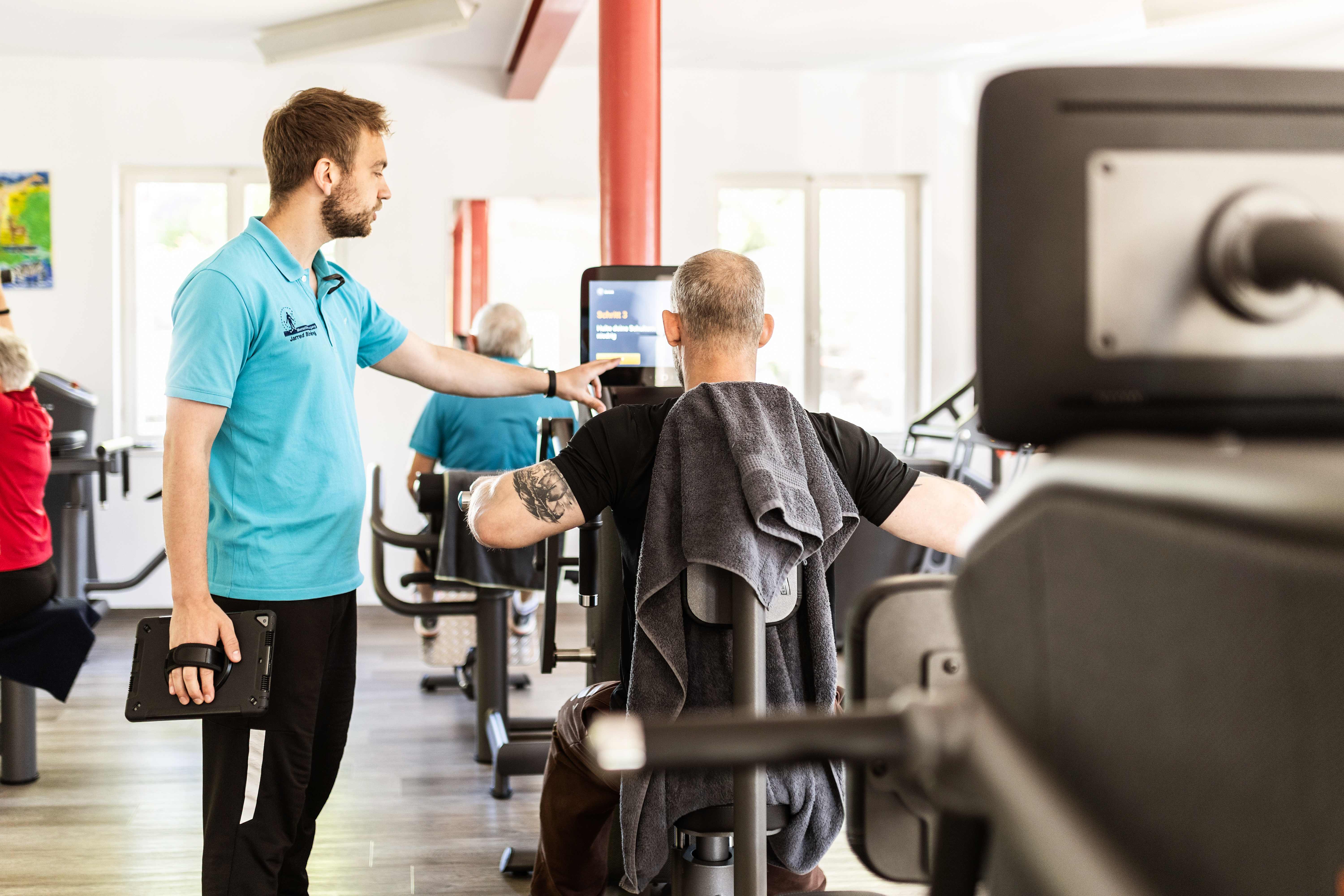 Seit Dezember ist die gesamte Familie der EGym-Geräte nun in unserem Haus vollständig vertreten. Zu den bereits vorhandenen acht Trainingsgeräten sind zwei zusätzliche Geräte hinzugekommen: ein Rotator, der speziell für die Muskulatur der Wirbelsäule entwickelt wurde, und eine Brustpresse, die darauf abzielt, die Brustmuskulatur zu stärken, insbesondere den Trizeps, der bekanntlich beim Winken oft wackelt. Ihr wisst schon, der Muskel, der bei vielen von uns schnell wackelig wirkt. Jetzt verfügen wir über das modernste und technologisch fortschrittlichste Trainingssystem mit einem hohen Motivationsfaktor hier auf der Jahnhöhe. Also, auf geht's! Termine zur Programmierung deines Armbandes sind an der Rezeption erhältlich.